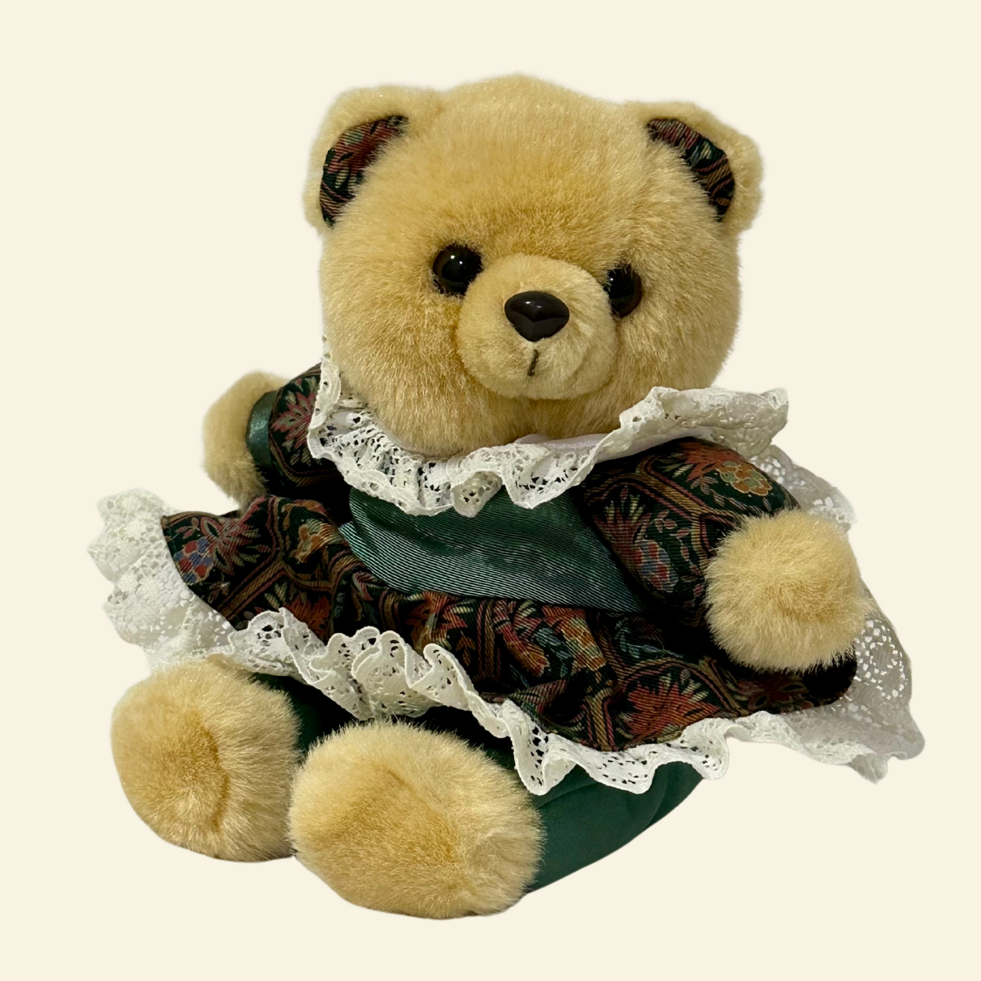 Here’s Mary Anne, a graceful bear with a love for timeless charm and a touch of old-fashioned sweetness. Dressed in her lace-trimmed frock with rich autumn tones, she looks as though she’s stepped right out of a storybook tea party. Mary Anne enjoys the finer, cozier things in life, afternoon tea (with extra sugar cubes, of course), listening to gentle music, and keeping traditions alive with warmth and care. She’s thoughtful, elegant, and has a way of making every moment feel special. Mary Anne insists lace never goes out of style, it just makes life prettier!